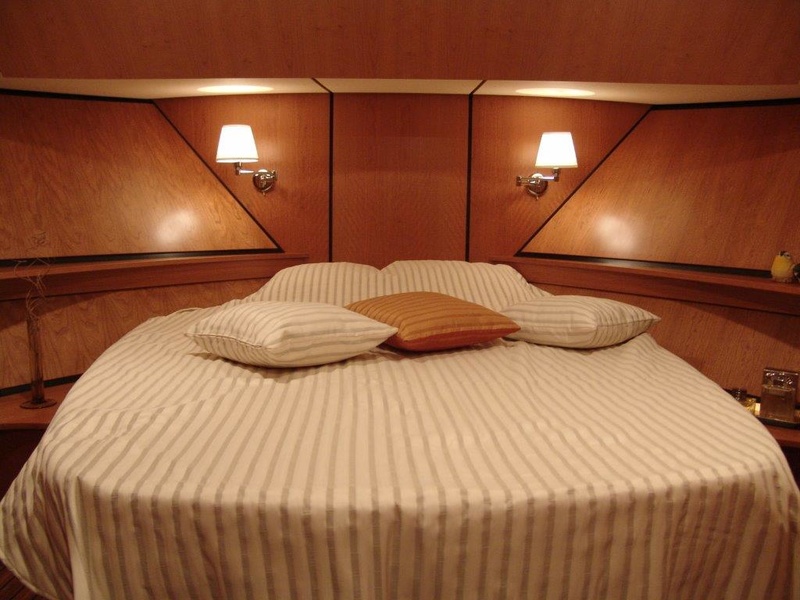 There are only three cabins and they are all finished with cherry wood in the classic Dutch style. Sleeping will be comfortable: aft and forward there are double beds, in the guest cabin there are two single beds, and on the galley there is a double sofa.