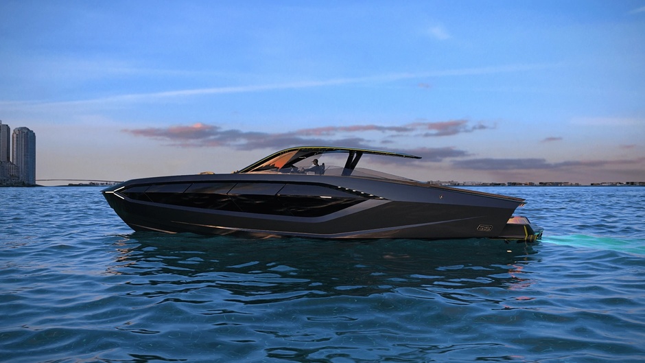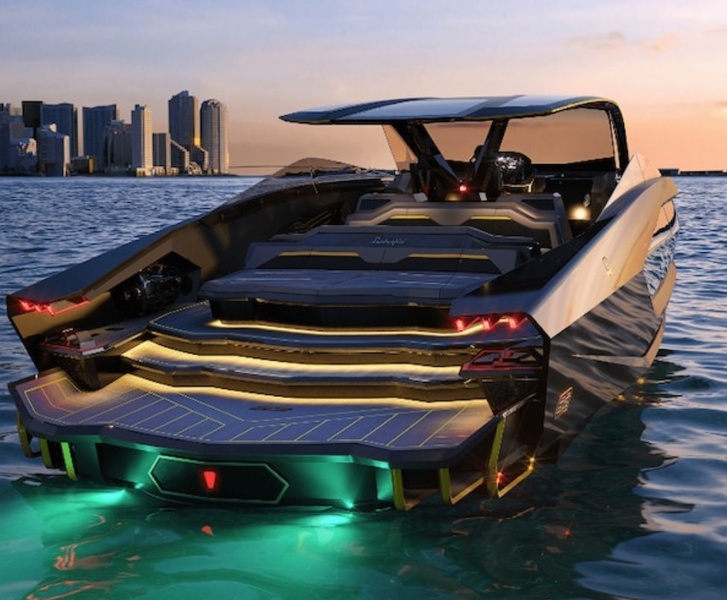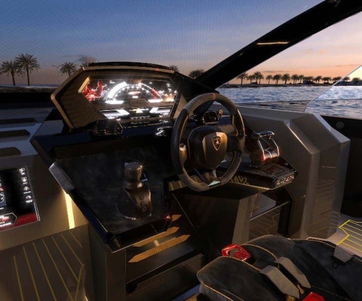 The design of the boat is inspired by the Lamborghini Sián FKP 37 hybrid supercar. The recognizable style of the famous Italian car brand is felt not only in the exterior but also in the yacht interior.