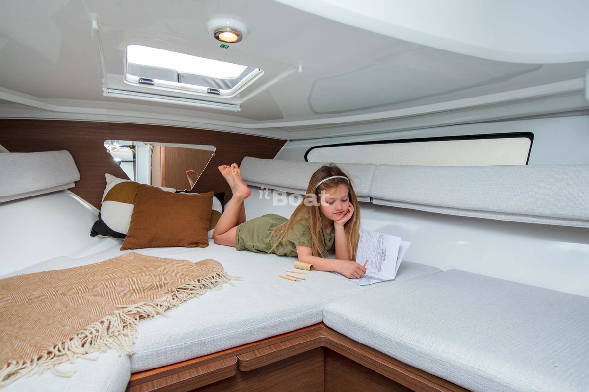 This boat Jeanneau absorbed the best features of the predecessors of the Cap Camarat 715 WA and 755 WA, gaining a new modern design and improved comfort. Compared to the younger models, it is more adapted to outdoor activities in the water by installing electric transom plates and winches, and useful features such as showers and chemical toilets are included in the basic package. The cabin is equipped with an opening hatch in the ceiling, additional handrails, and most importantly, a separate bathroom, prepared for mounting a sea toilet and storage tank. Another feature is the possibility to use both one 300 hp engine and a bundle of two 150» hp hangers«.