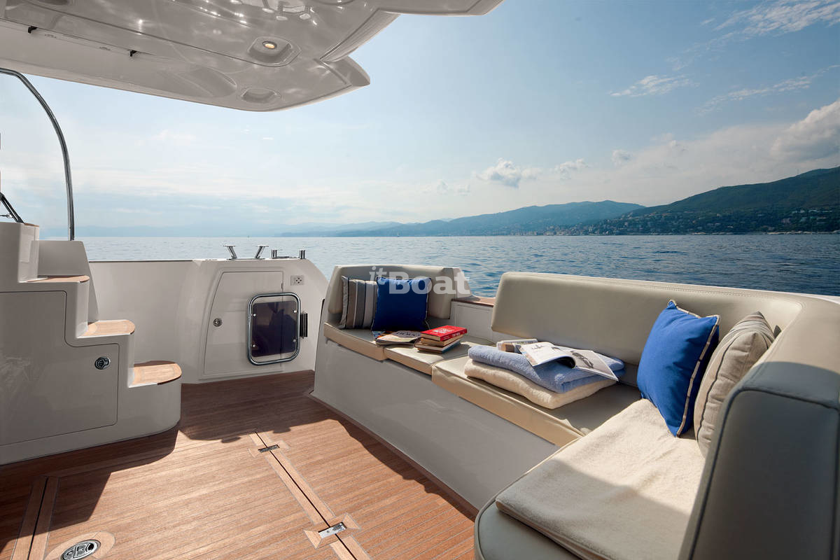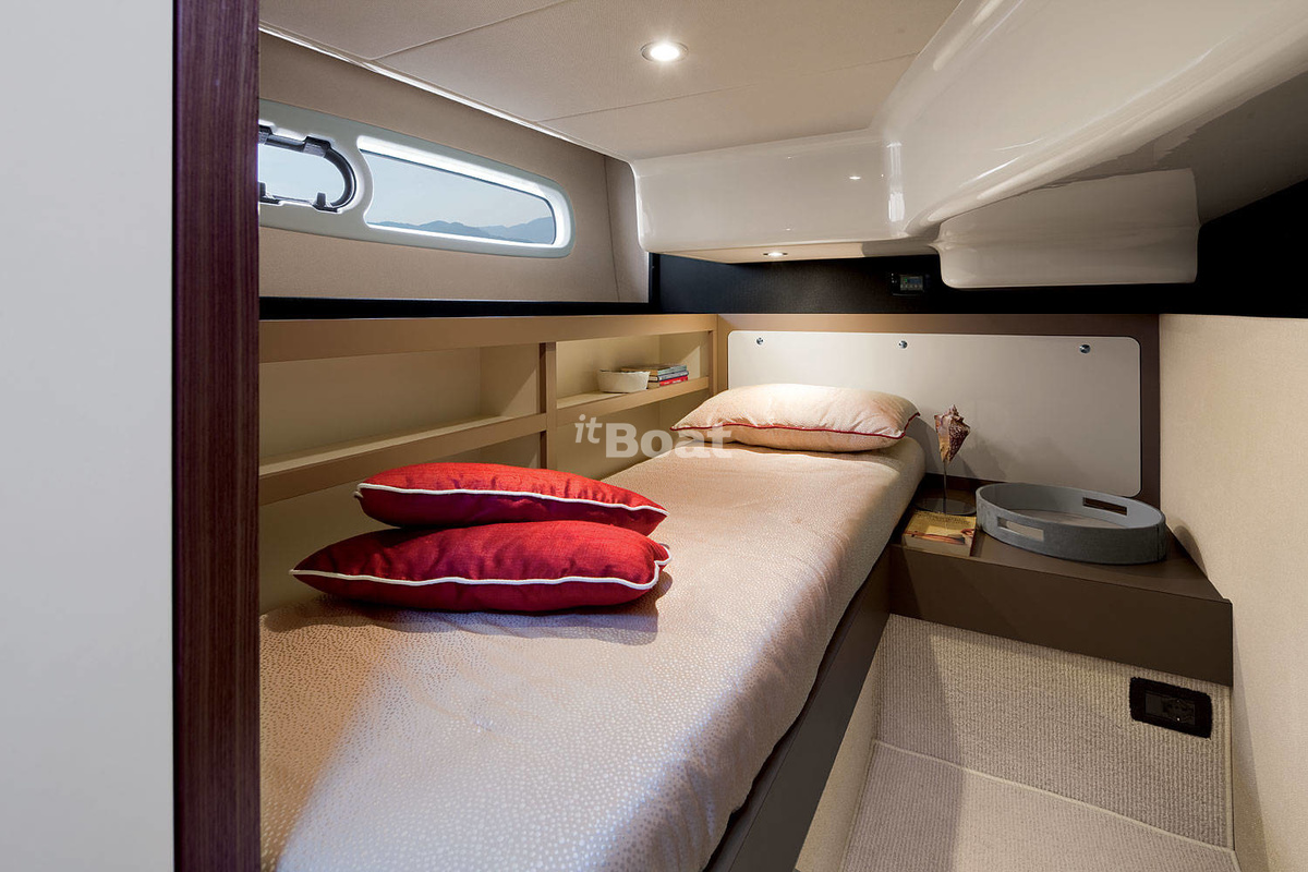 The galley, as compact as the main deck saloon itself, is located at the entrance to the left, then there is a U-shaped sofa with a table. To starboard there is a console with wardrobes and TV and a control post with an adjustable seat. Circular glazing provides an excellent view for both guests and the steering wheel.