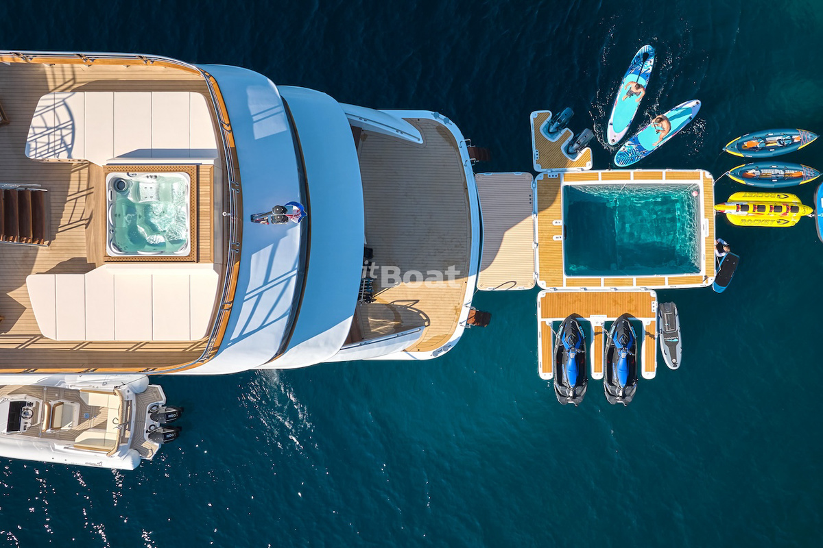Aft of the boat is a wide bathing platform, followed by a spacious sunbed. At the bow there is another sunbathing area, which can be transformed into a relax area with a table and a U-shaped sofa. The console has a toilet with washbasin. The cockpit itself is quite spacious, of course, the boat's almost three meters wide played a role in this, but the main thing is the absence of a pilot's chair.