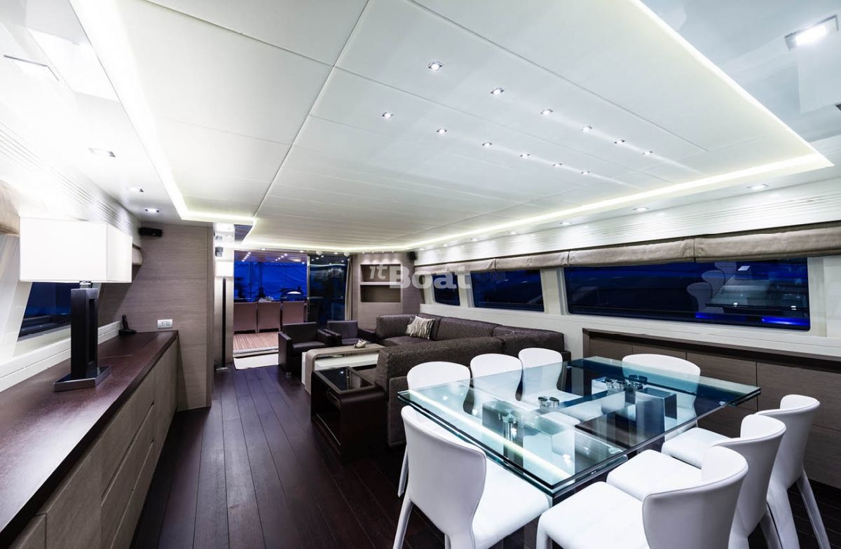 Favorite place to party is the upper deck. She has a huge lounge, dining area, bar and grill. The main deck saloon is combined with the aft terrace through sliding doors, creating an even larger seating area. The kitchen, as is the case for boats of this class, is set aside in a separate area. On the lower deck there are 4 double guest cabins.
