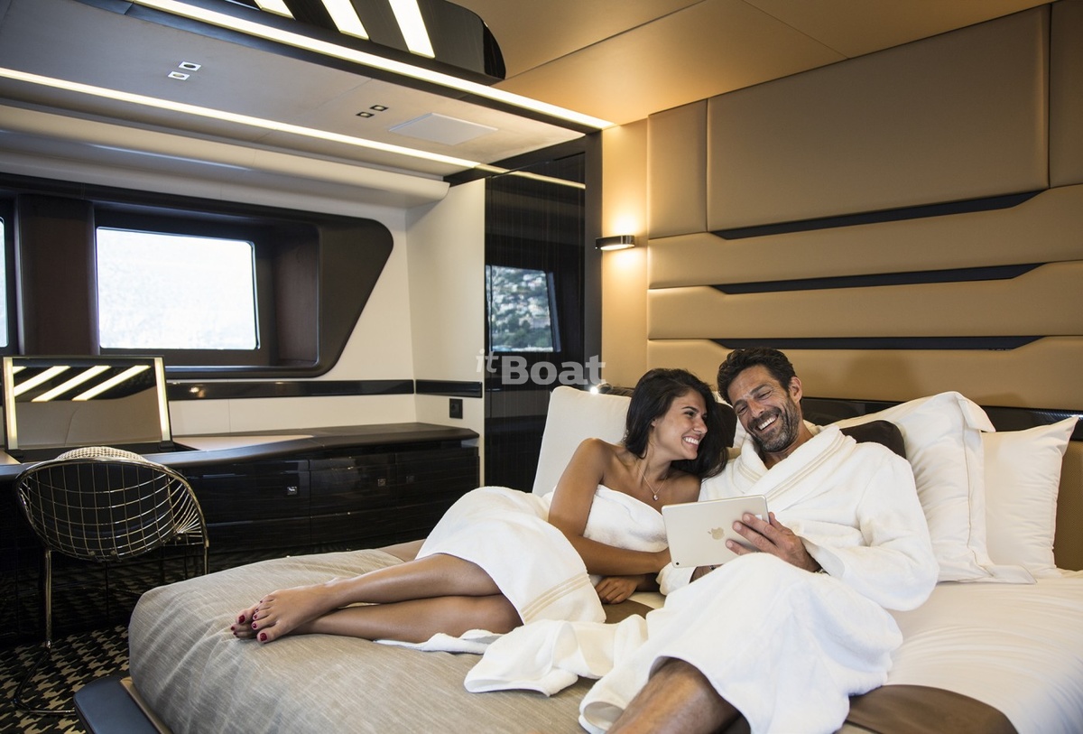 For her guests, the yacht has prepared spacious guest areas with a ceiling height of over 2m, as well as a huge sundeck with several separate rest areas. Unusual for a yacht of this size, the front garage allows for a tender or jet-ski even when the yacht is in port. The Dynamiq GTT 115 is equipped with a new generation of multilayer XIR glass, which has maximum light transmission and at the same time restrains heat.