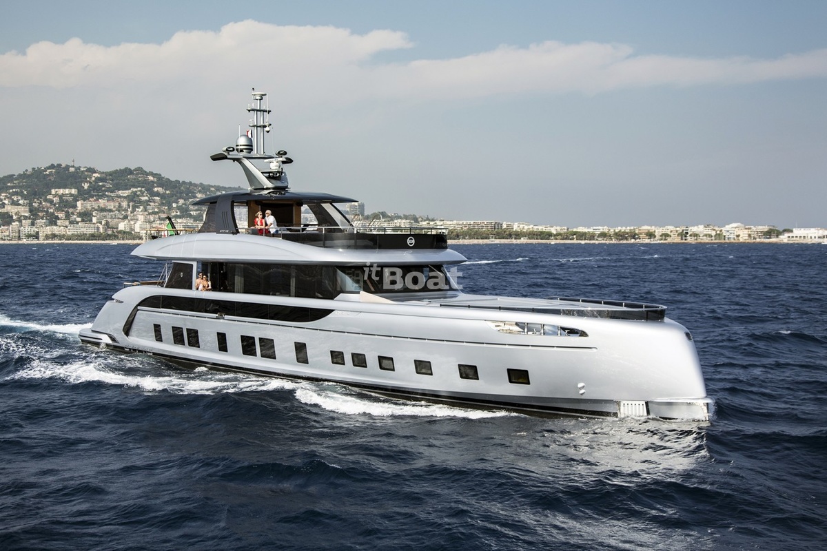 The motor yacht Dynamiq GTT 115 is produced by the brand Dynamiq Yachts since 2017. The Dynamiq GTT 115 is a 35.50 meter semi-displacement yacht with 3 guest cabins and a draft of 1.45 meters which can reach speeds of up to 21 knots. The yacht has a aluminum hull with a CE certification class (A) and can navigate the open ocean. The base price of a new Dynamiq GTT 115 is €17.9 million.