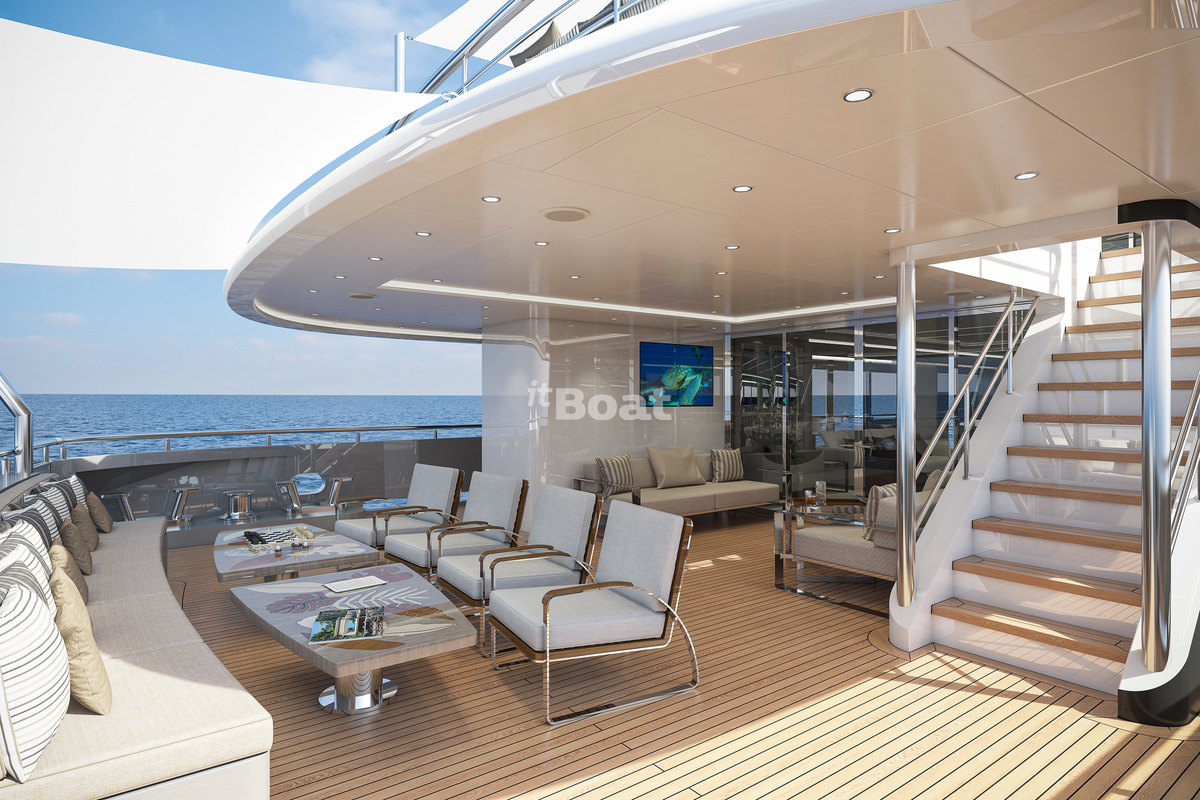 Thanks to the wide entrance to the superstructure, the interior and exterior spaces flow smoothly into each other, and the sofas in the cabin and aft form a dining area with a large folding table. A passage to the left of the control room leads to a double cabin and a separate bathroom. The boat has spacious lockers for storing things and equipment.