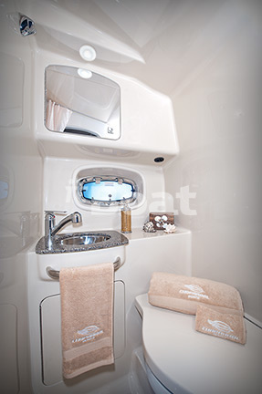 The boat has a width of 3.20 meters, which made it possible to create a fairly spacious interior of the lower deck, which can accommodate 5 people for the night. The manufacturer offers two options for layout of the lower deck. In the first case, the bow has a traditional dinette with a V-shaped sofa and a table on a telescopic leg.the time of sleep is set by an inflatable mattress-filter, with a couch on the left side of the midsection, and on the right side, respectively, the galley.