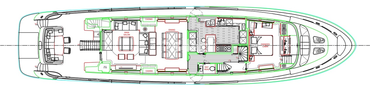On a cozy sundeck you can fully enjoy the trip, it has two loungers, a spacious sunbed and a sofa. The upper deck has a terrace with a table and a sofa, behind which there is a control station. The main deck is occupied by common areas, while the fore deck has an owner's cabin.