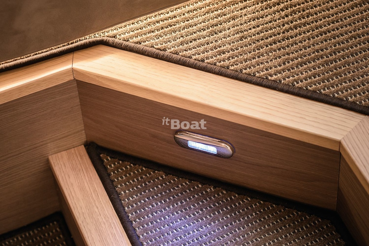 The first project in the new segment was created by Felci Design, a regular partner of the yard. The arch above the cockpit (a la Beneteau) and the carbon fiber mast are immediately visible. A third telescopic table is placed in the transom section, between the helm stations, which can become a solarium. There is also a summer kitchen: grill, sink and fridge. The swimming platform hides a full-fledged «dinghy garage» with outboard engine. In the salon the galley has returned to its usual place - on the port side at the entrance. The size of the cabin accommodates a full dining area and lounge. Huge ceiling hatches provide plenty of light. In addition, LED lamps are hidden everywhere, whose light creates comfort.
