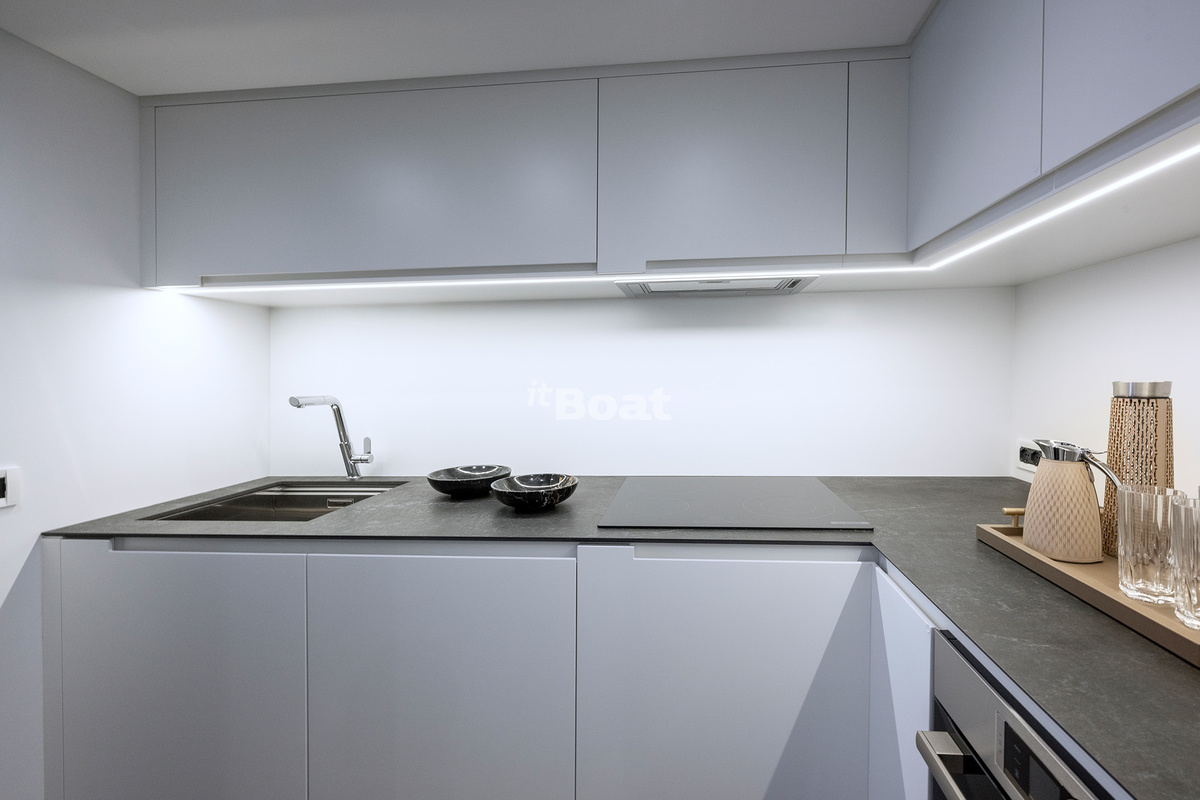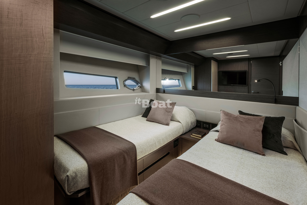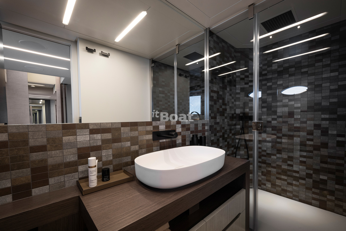 Thanks to Videoworks, Pershing 8X has a «musical» hull. This is how the leading Italian manufacturer of entertainment onboard systems positions its powerful loudspeaker system. In other words, the quality of sound on the boat is amazing, as well as the sound underwater. For those who love diving, this equipment gives new sensations during the dives.