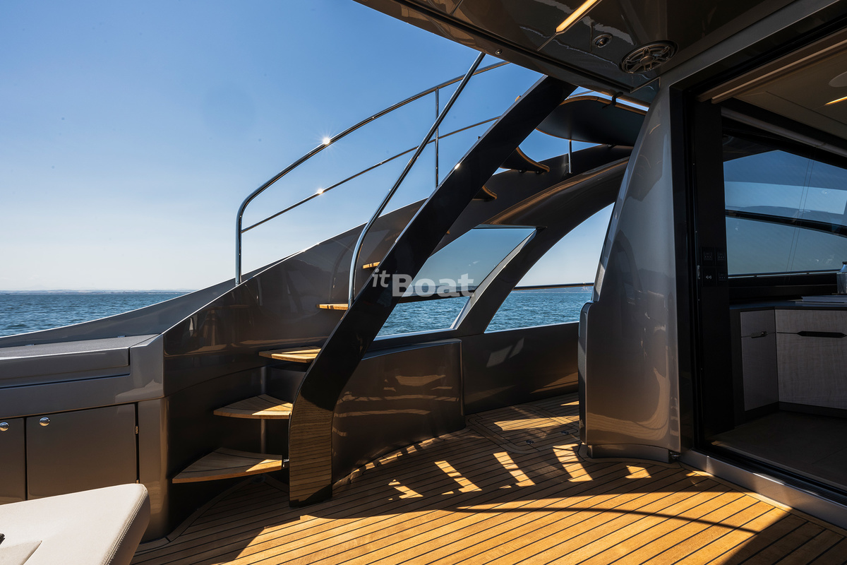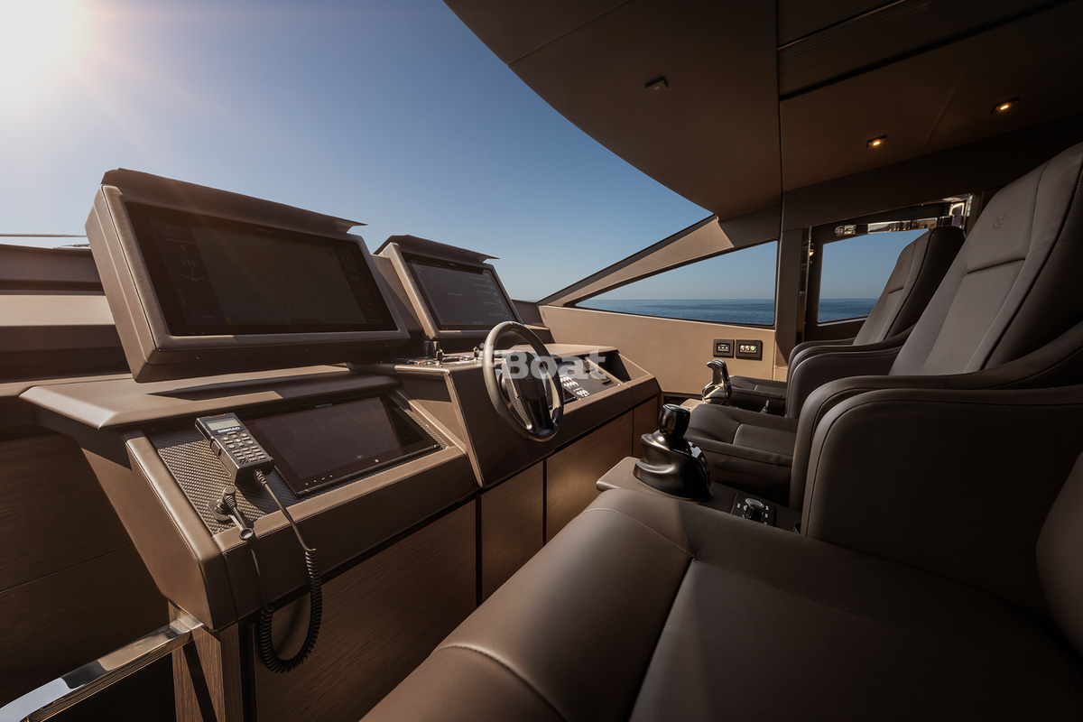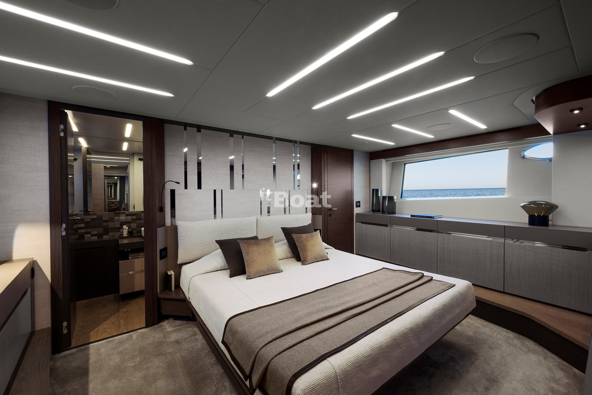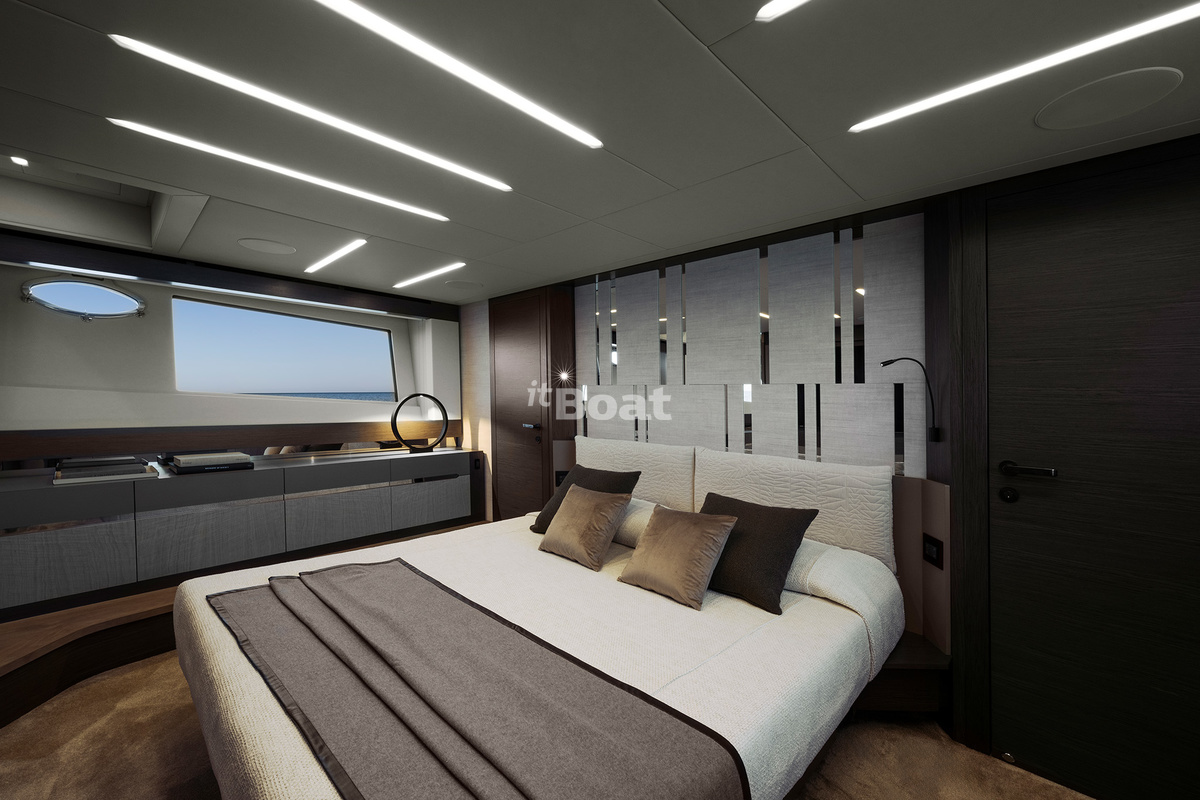 The boat represents the evolution of the Pershing 82 while standing out with even smoother and more sporty lines than the predecessor. Like the previous models, the yacht owes its bright design to the famous Fulvio De Simoni studio. The yacht features large windows and plenty of open space. Interiors in light tones read luxury with a touch of pragmatism.