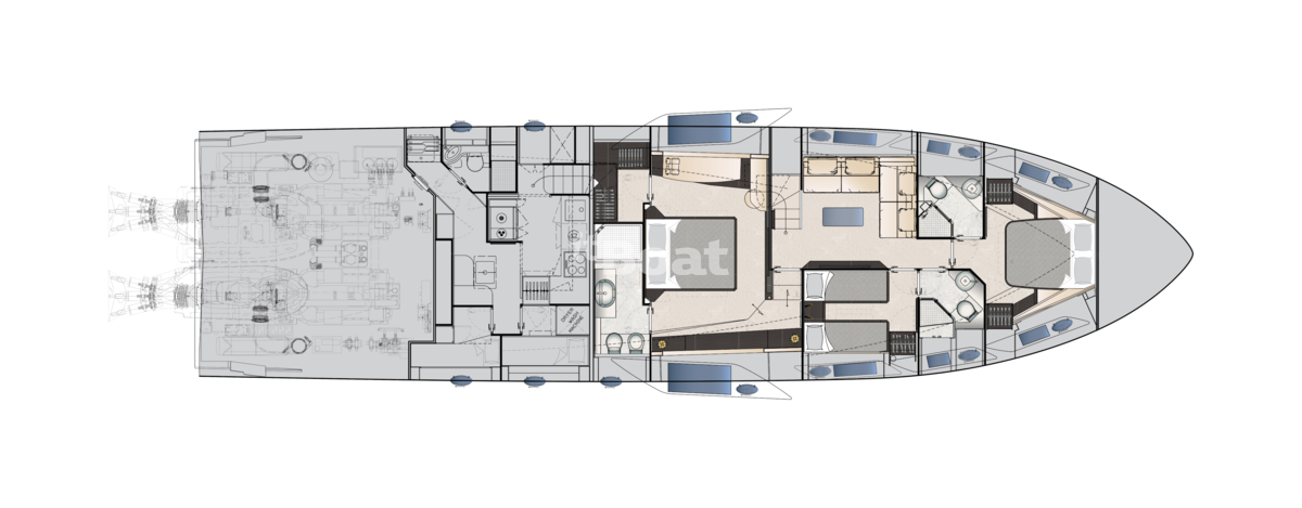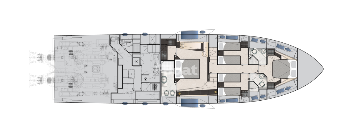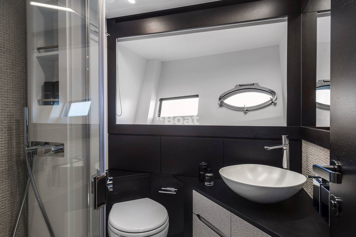 The 25.55-metre boat can comfortably accommodate up to 8 people in four fair cabins. On the lower deck, apart from the cabins, there is a spacious garage for the Williams Sportjet 345 tender and a water bike.