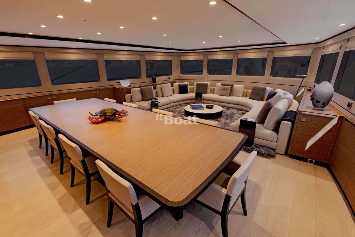 Unlike the GTO, there is no sunbathing area in the stern, its place is occupied by a large terrace, grill and bar, which smoothly passes into the galley. Due to its larger width, the living room opposite the kitchen has a living room (it can be replaced by an additional bedside table), and the dining room has a separate area next to the control station. The lower deck remains unchanged and also includes three or four cabins.