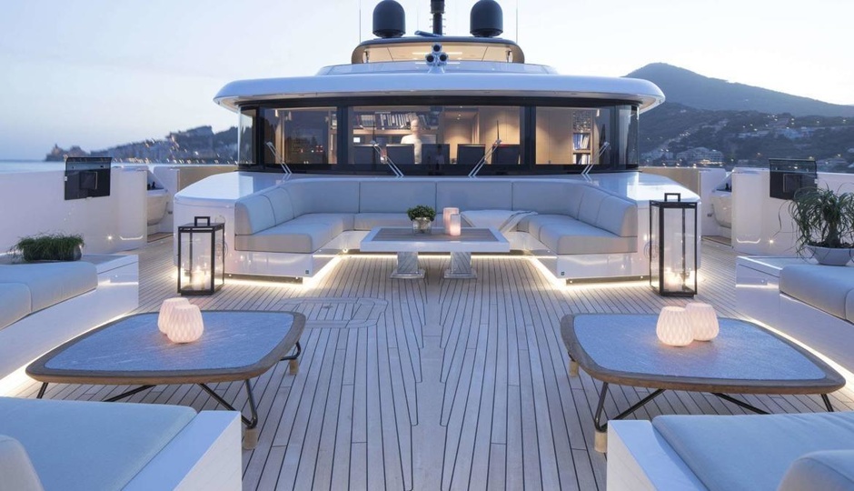 The interiors of the yacht use a combination of white, beige and brown colors to create a cosy and fresh atmosphere. The crowning achievement of the Italian designers is the 12-tonne transparent-bottom pool, which looms over the beach club.